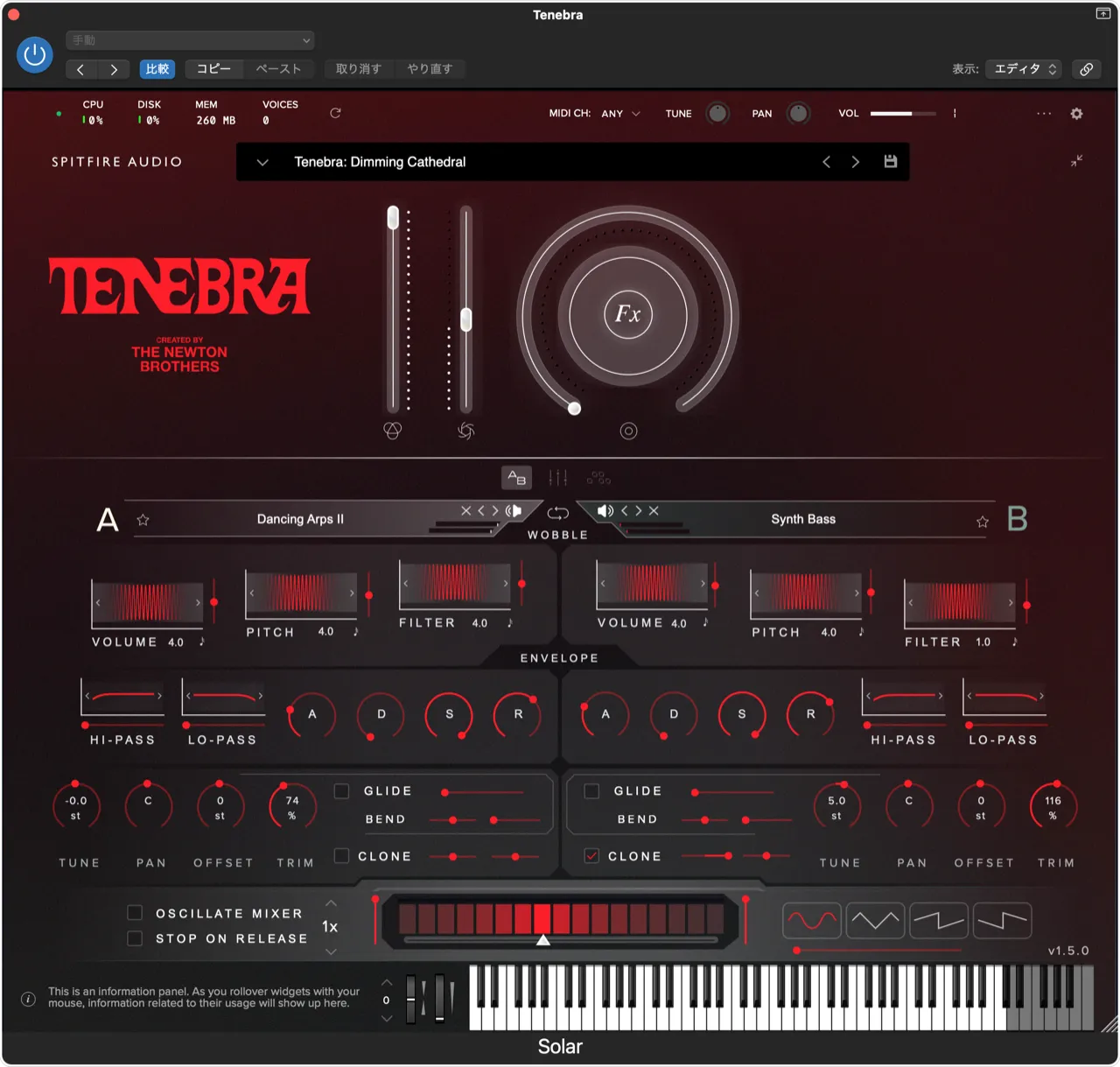 さて、Tenebraですが、楽器として使える音色もあるにはあるものの、それよりも音効用途の趣のほうが圧倒的に強い。収録サンプルの時点でだいぶエディットされているので、Solarエンジン上で追加の加工が必要になることはあまりありません。